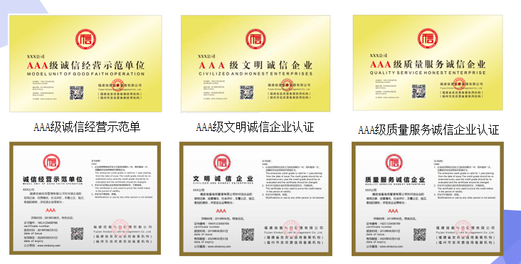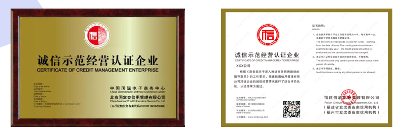 “中國誠信供應(yīng)商”認(rèn)證:國際貿(mào)易類,在全國行業(yè)信用公共服務(wù)平臺(tái)、中國電子商務(wù)網(wǎng)、中國商務(wù)信用平臺(tái)權(quán)威公示。