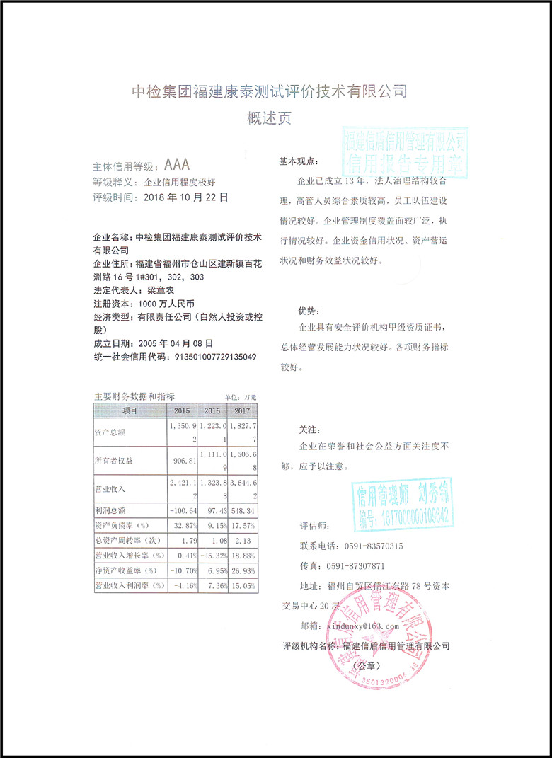 中檢集團福建康泰測試評價技術有限公司2018