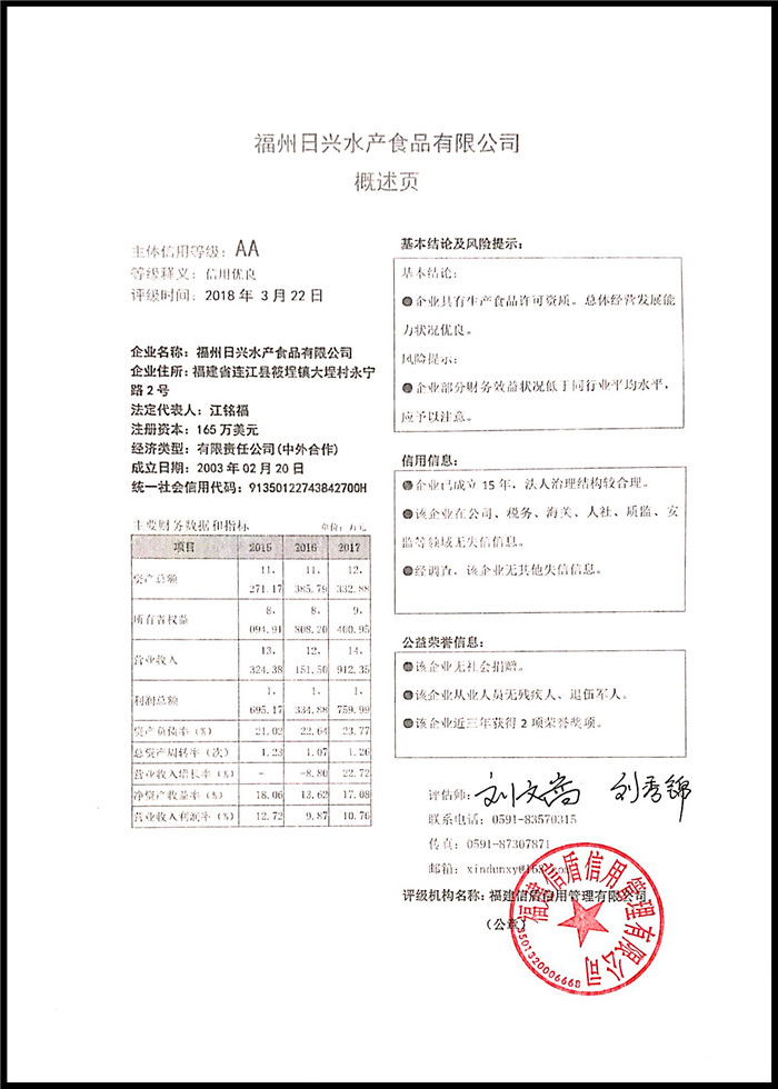 福州日興水產食品有限公司 XDPJ201803192